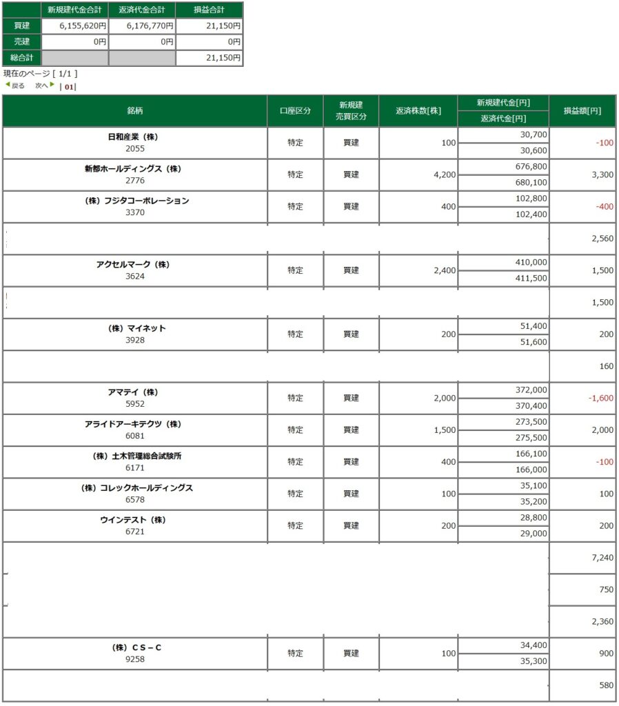 大発会から現在までの利確損切銘柄達-合計+197,000円